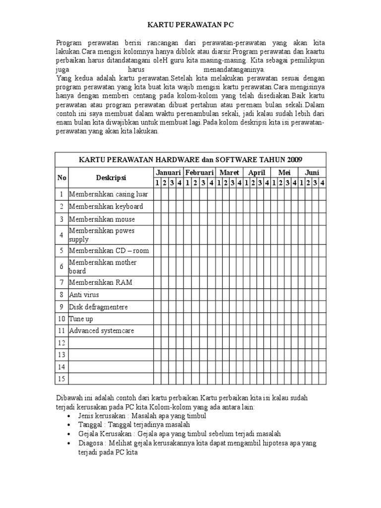 Untuk preview atau tampilan dokumen bisa dilihat melalui gambar diatas Semoga bermanfaat. Penggantian suku cadang Bagan Alir Perawatan Berkala Operator Mandor Asisten Divisi Staff Traksi Mekanik Krani Traksi Kartu kerja jadwal servis Mengatur unit pengganti Koordinasi dengan staff traksi Koordinir Perawatan penyiapan part Pemeriksaan perawatan Alokasi jam kerja administrasi Contoh Jadwal Service. Ibaratkan computer anda sebagai teman yang selalu menemani anda manusia aja kalau tidak dirawat pasti suatu saat juga akan sakit.