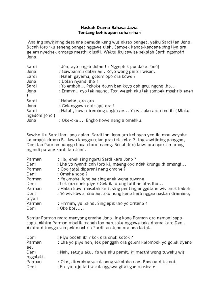 Dereng wonten murid sing teko sakliyane wong loro kuwi. Contoh Sandiwara Bahasa Jawa Aneka Macam Contoh. Sandiwara dalam bahasa jawa.