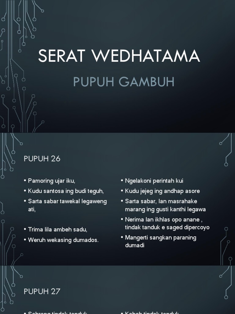 PUPUH III G A M B U H 01 Sekar gambuh ping catur kang cinatur polah kang kalantur tanpa tutur katula-tula katali kadaluwarsa kapatuh katuruh pan dadi awon. Seat tulisankarya Weda Ajaran Pengetahuan Suci tama keutamaanutama. Karya ini secara formal dinyatakan ditulis oleh KGPAA Mangkunegara IV.