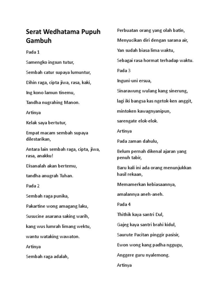Serat Wedhatama ngemot limang pupuh tembang macapat yaiku Pangkur 14 pada Sinom 18 pada Pucung 15 pada Gambuh 35 pada lan Kinanthi 18 pada. Pupuh gambuh dan artinya dalam bahasa jawa PADA 1 Samengko ingsun tutur sembah catur. Uuiuo Guru wilangan.