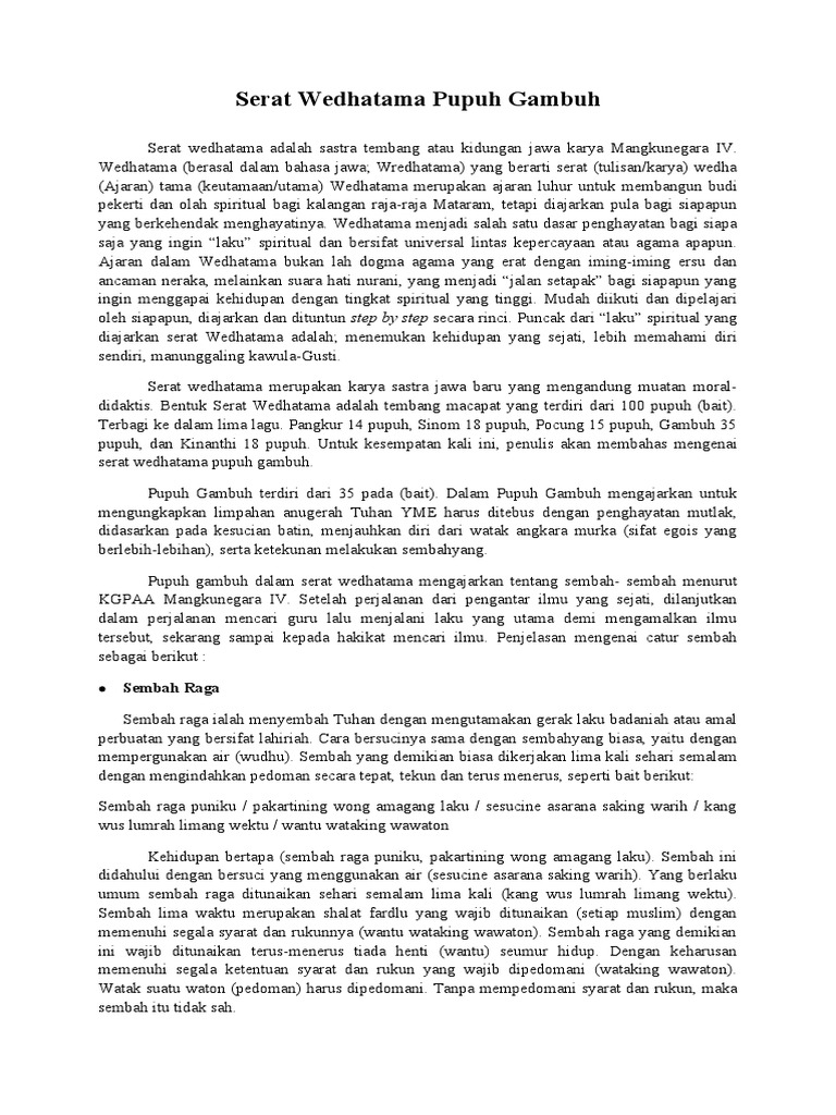 Bagaimana konsep metafisika yang terkandung dalam serat Wedhatama penulis memakai metode analisis dan pendekatan sejarah. Pangkur 14 pupuh I - XIV Sinom 18 pupuh XV - XXXII Pocung 15 pupuh XXXIII - XLVII Gambuh 35 pupuh XLVIII - LXXXII Kinanthi 18 pupuh LXXXIII - C Isinya adalah merupakan falsafah kehidupan seperti hidup bertenggang. PUPUH GAMBUH DAN ARTINYA DALAM BAHASA JAWA.